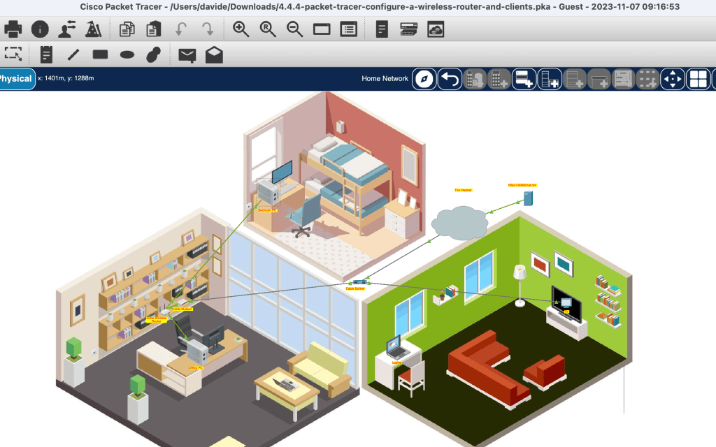 Continuing the instruction within Cisco’s Networking Academy, this morning I worked on setting up a situational home network- using virtual coaxial cables to connect the home router with the cable splitter, which in turn was also connected to the smart tv. From the home router, which included a switch with four ethernet ports and a built-in wireless router, I ran cable to two PCs, enabled DHCS for IP addresses, and also enabled the wireless router and configured it to limit the number of clients, to increase security protections, and more. This last piece then allowed me to connect the two laptops wirelessly. At the end of the exercise, the wireless router connected two laptops to the internet, while the built-in switch connected two PCs with ethernet cabling to the internet. The intermediary devices, the cable modem and the wireless router, were key pieces for connection to the ISP.