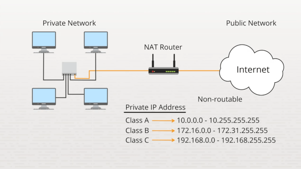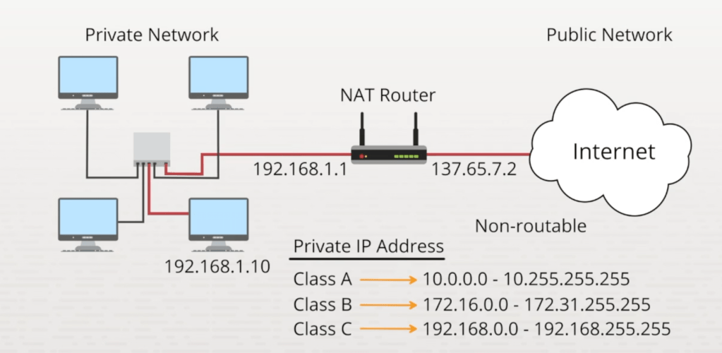 The client at 192.168.1.10 can send a request to the internet and that request packet will go to the gateway route: 192.168.1.1, the interface of the NAT router facing the internal network. The NAT router will then forward that request to the public network using it’s public-facing interface with IP address 137.65.7.2; that is the IP address that is part of that paid-for, scarce IP address pool. Any response from the public network will be directed to that same IP address (137.65.7.2) and the NAT Router, packet in hand, will understand that the original requester was 192.168.1.10 and send it there.