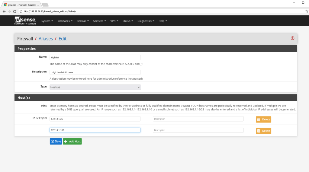 For hands-on, I’ll be using PfSense, a firewall appliance. First, to create a high usage user alias, two users in this case: