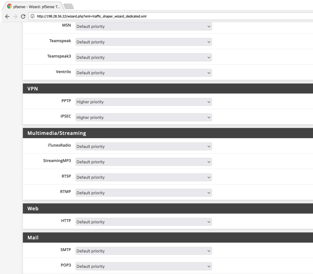 Next, there are a variety of options to configure, such as what applications one wishes to limit or to prioritize, including VPN. Here I have prioritized those services: