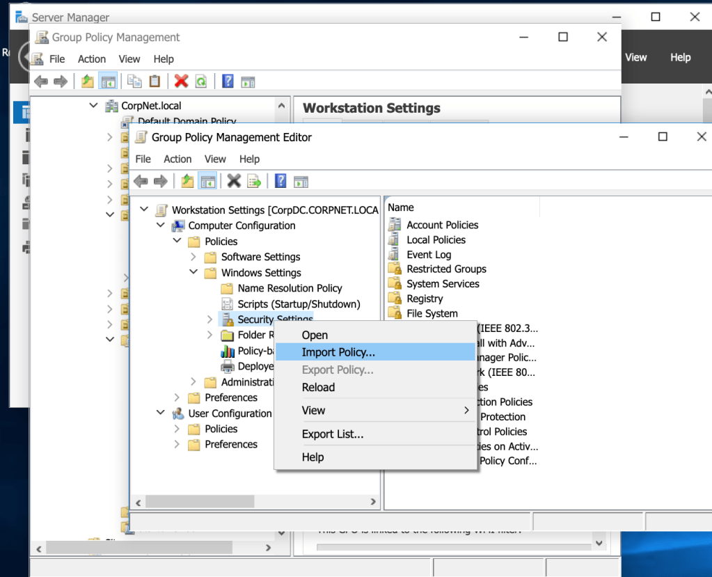 In a subsequent exercise, I imported a security template to one of the GPOs, like this (lots of Windows tiles!):