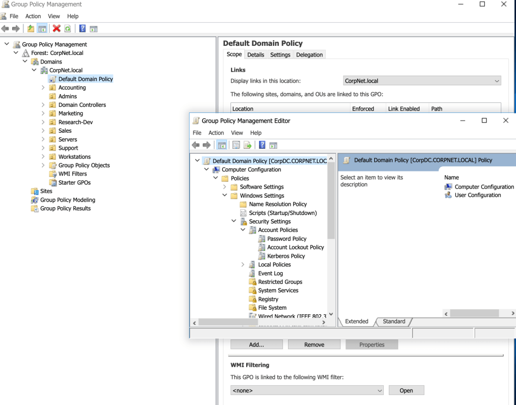 To get some hands-on practice setting and configuring Kerberos, I took the following steps to change policy attributes. Within the Windows Server, I navigated this tree of sub-directories to arrive at ‘Kerberos Policy’ under ‘Security Settings’: