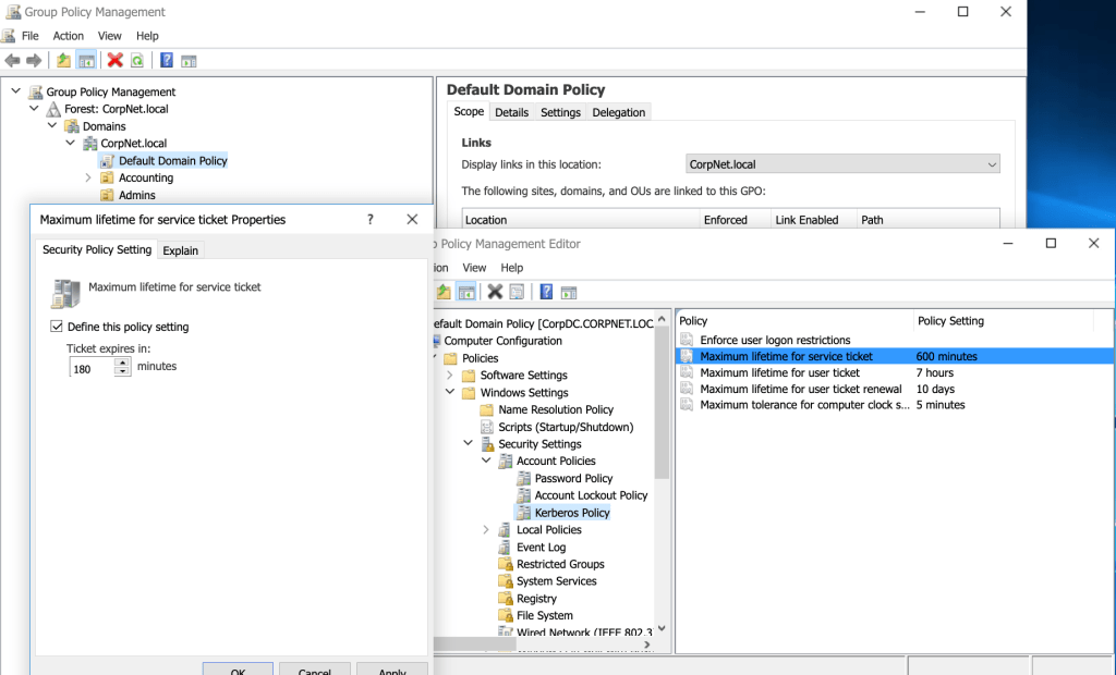 For example, to decrease the default value of the maximum lifetime for a service ticket from 600 minutes to 180 minutes, I made these changes in the appropriate policy:
