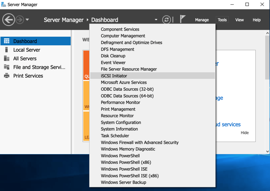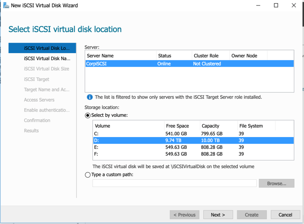 There are three SAN components: host, storage, SAN fabric (cables, networking hardware). All SAN storage devices are called targets, while the initiators are the servers that have the special software to connect to the targets. I’m going to be configuring both of these. Specifically, I’ll be creating a virtual iSCSI target, and add an access server.