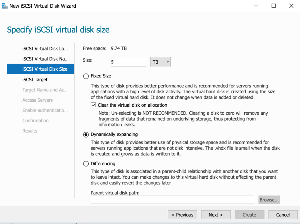 I select the drive that I want to use for the disk location, and then set the desired disk capacity (5TB):