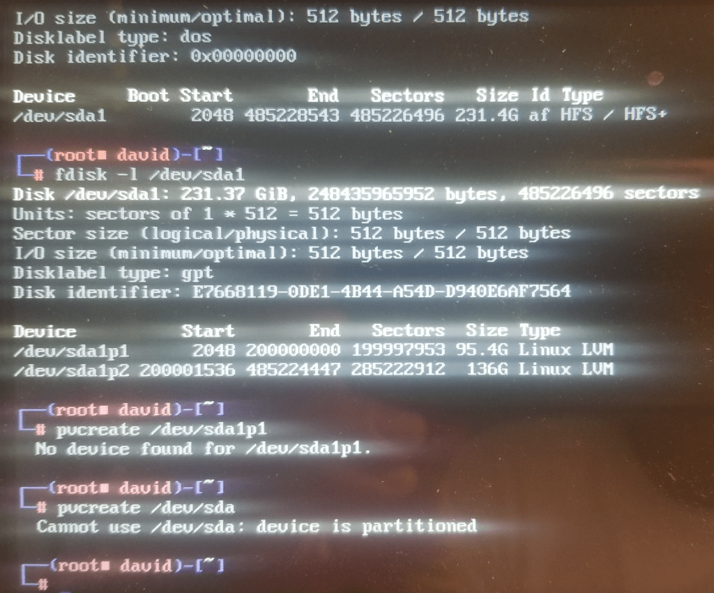 Unfortunately, I received a “no device found for /dev/sda1p1” error. But! But! It’s right there, listed under $fdisk -l /dev/sda1! Okay, time to troubleshoot…