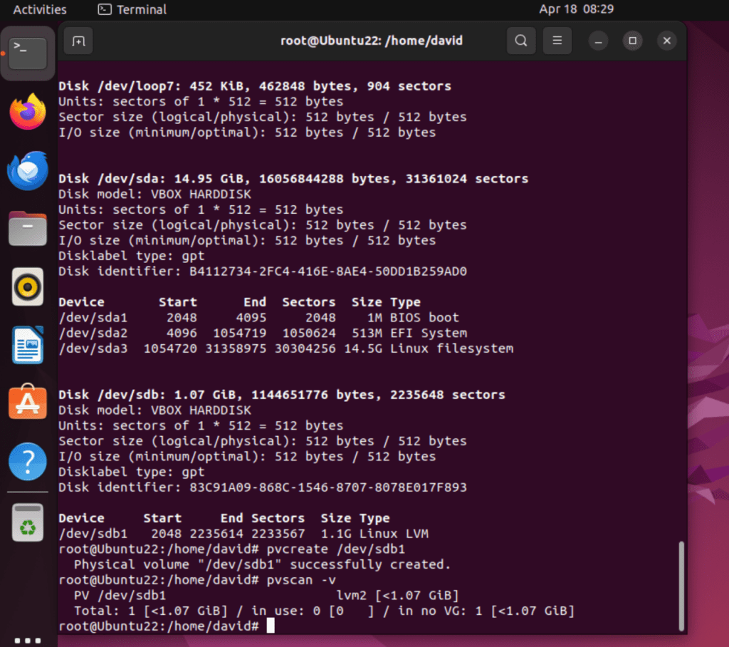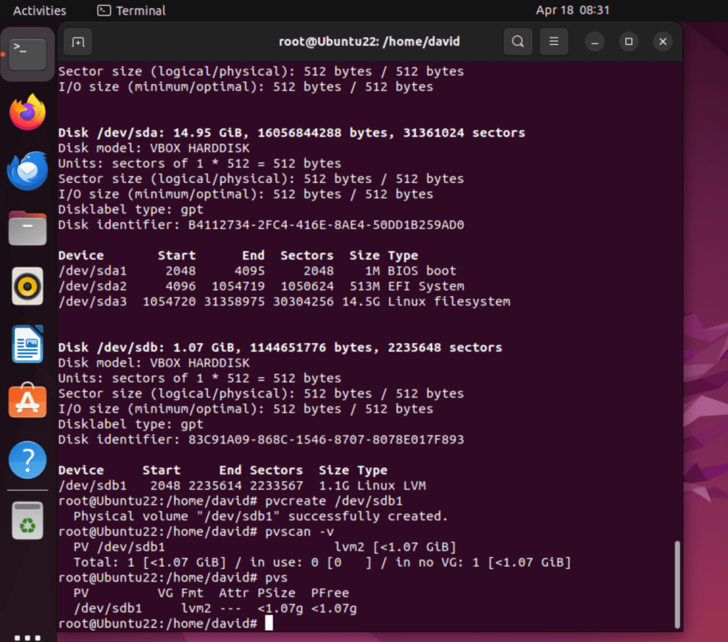 In my other post around adding a VMI hard drive, I added another 1GB virtual hard drive, created a GUID and also a Linux LVM partition type. This is part of PHASE ONE, where we need to create LVM physical volume. I have pivoted from working with the raspberry pi to the Ubuntu 22.04 VM run on VirtualBox from here on out.
