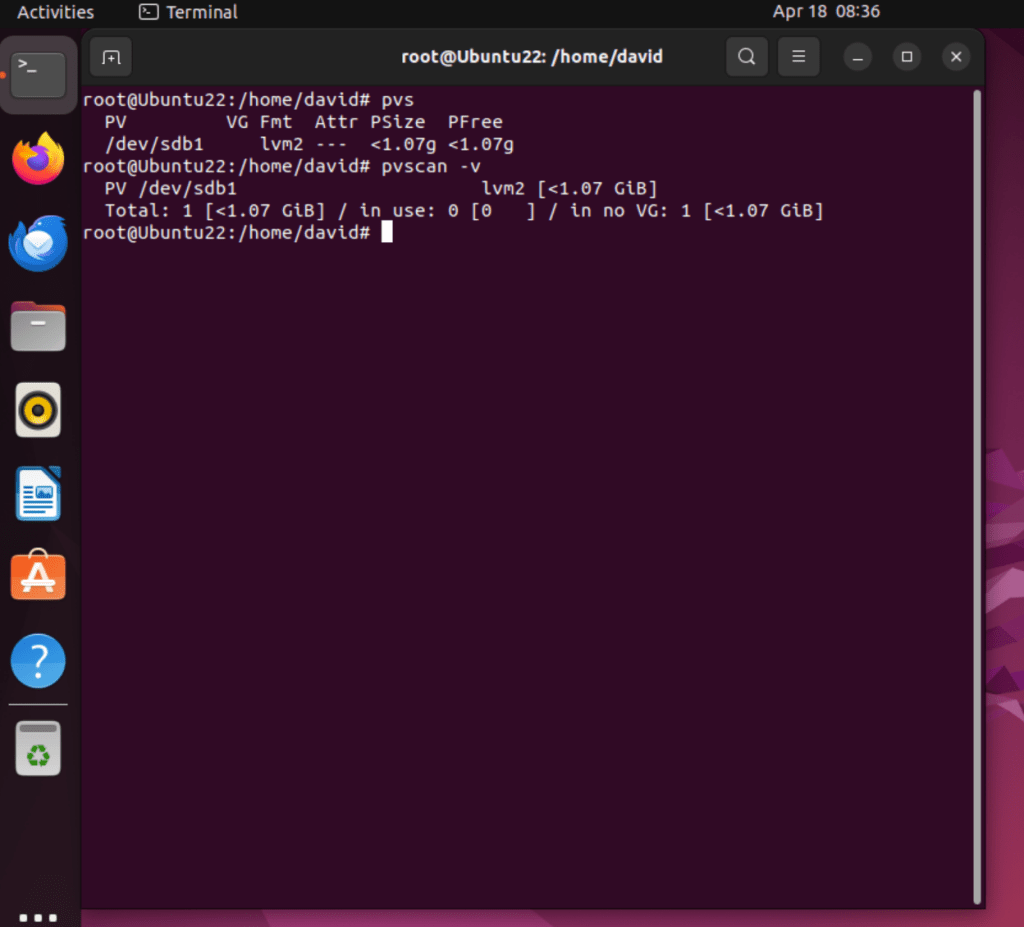 Here’s a snapshot of those two commands (pvs and pvscan -v) in action: