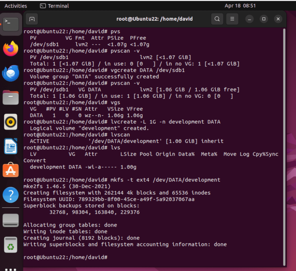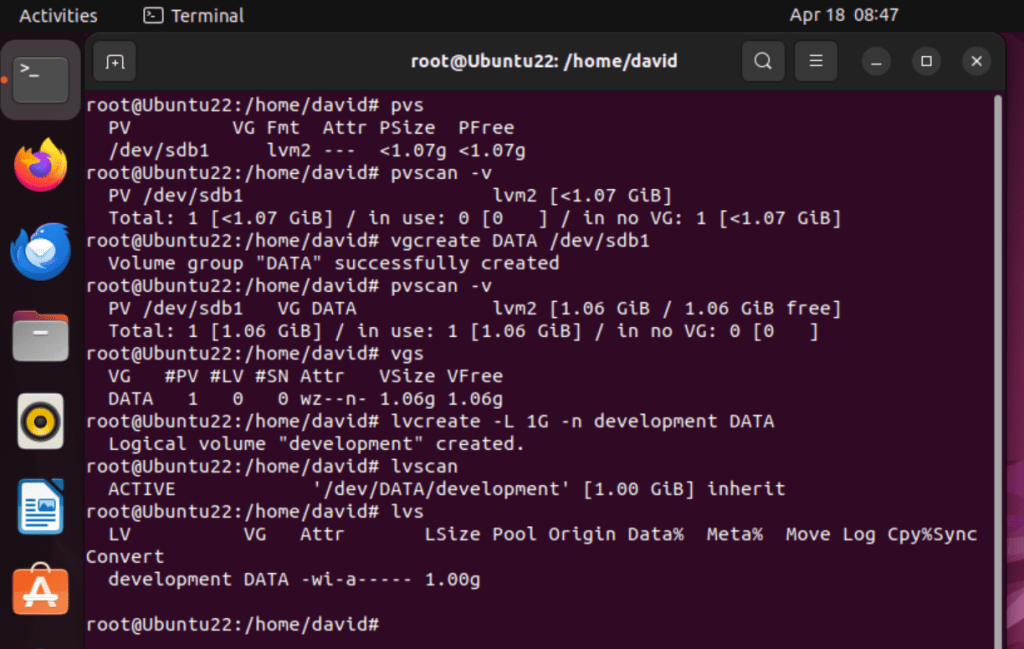 The ‘lvcreate‘ command is used for this. Here, I created a 1GB volume named ‘development’, defined from the DATA volume group. I then used the ‘lvscan‘ command to view the logical volumes defined, and then ‘lvs‘ to display the logical volumes: