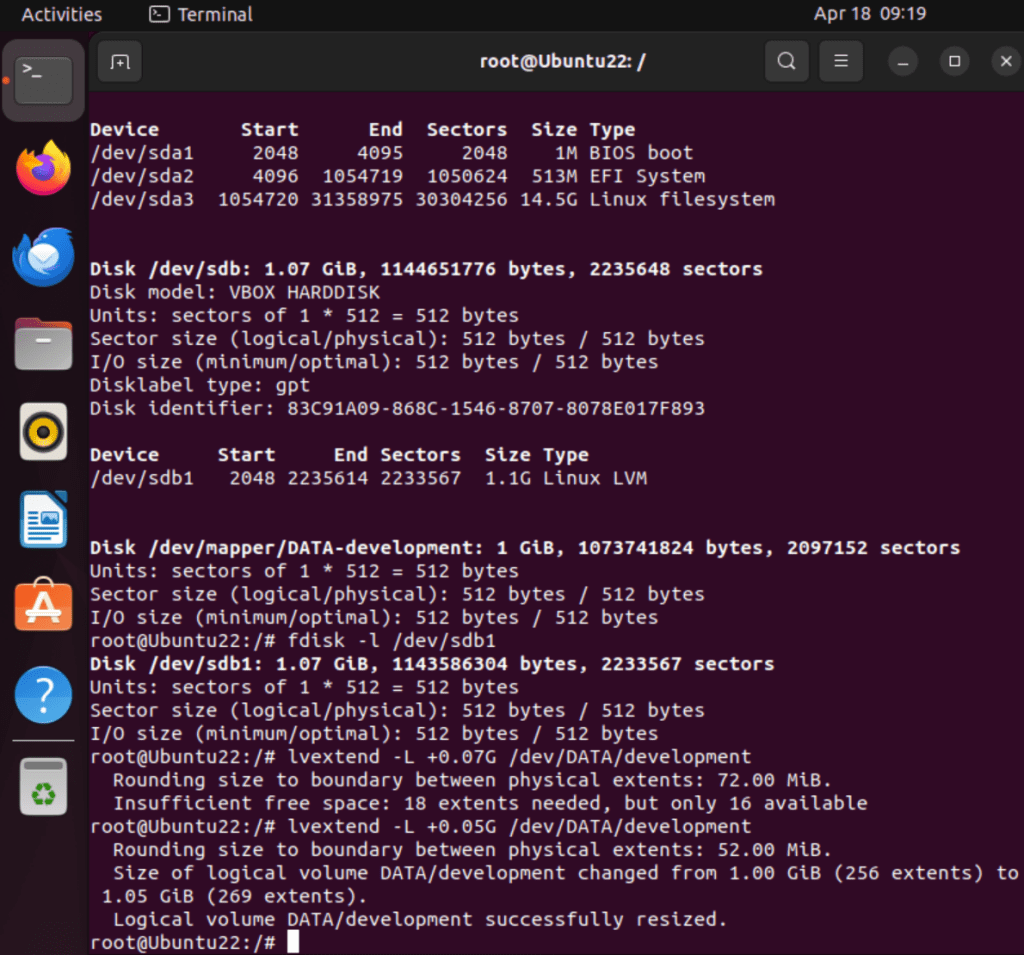 Here I extended the LVM Logical Volume ‘development’ the remaining 0.05GB, changing the logical volume from 1.00 GB to 1.05GB: