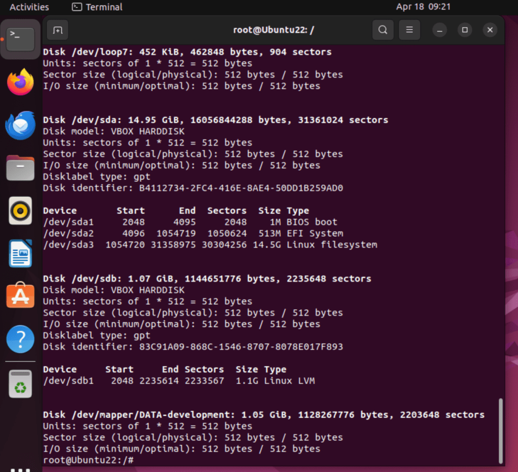 In a previous post, I added a virtual hard drive, partitioned it, used that partitition as a Physical Volume > LVM Volume Group (DATA) > LVM Logical Volume (development). That was a 1GB logical volume out of a total 1.06GB hard drive. Now, to enjoy the benefits of a LVM partition and dynamically extend it using the ‘lvextend’ command.