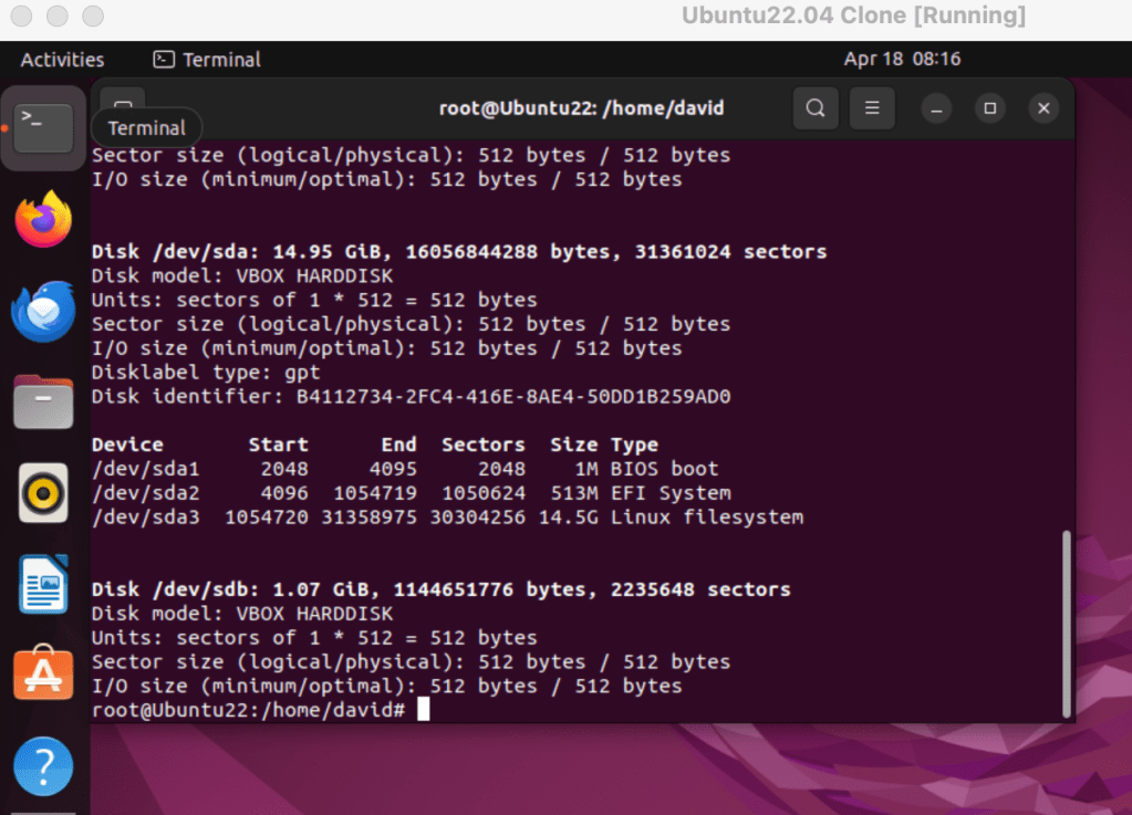 After I clicked that icon, I added an additional HD image of 1 GB. Once I selected ‘ok’, it was viewed in the VM following the $fdisk -l command: