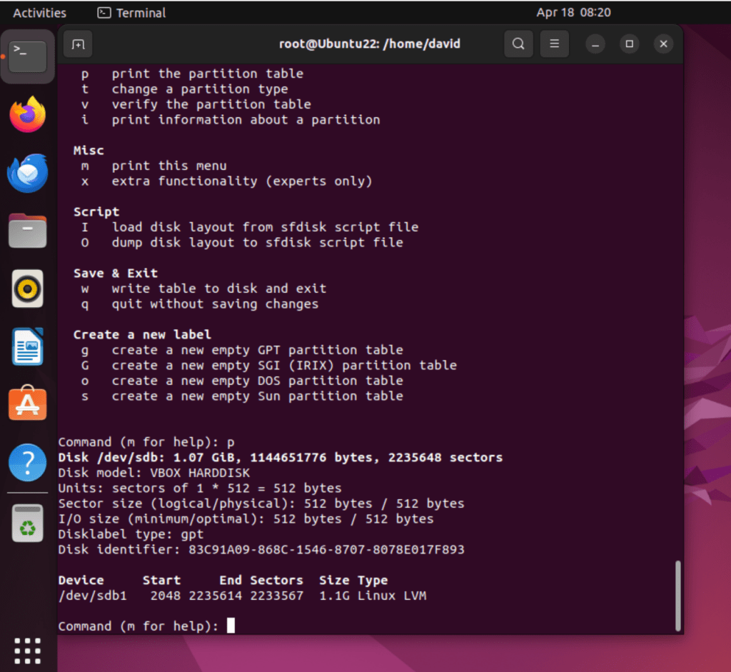 With that additional storage, I can experiment with the LVM configuration. Here I used fdisk to create a GUID and then create a partition using the Linux LVM (8e) type: