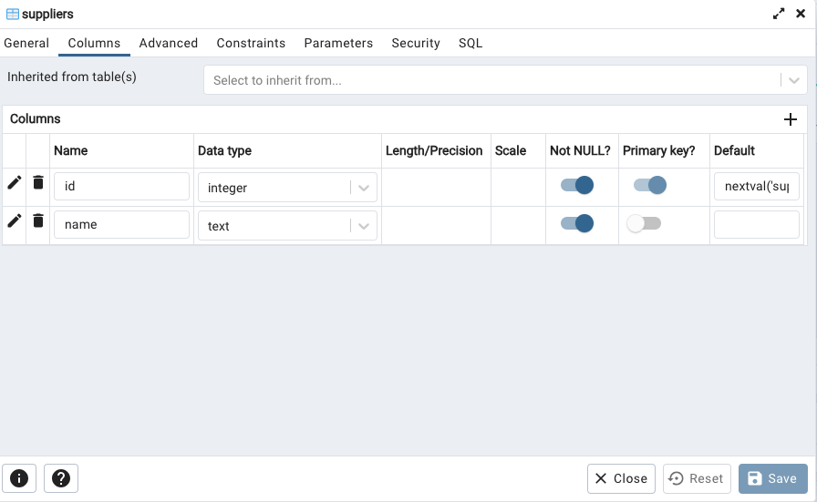 Boom! Now to create a table for suppliers: id will be SERIAL again, and name will be required but won’t need to be unique: