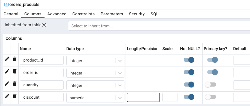 There can be many orders and many products, a many-to-many relationship, so we need to build a bridge table between orders and products tables. We’ll call it orders_products table. It’ll need to hold product_id (foreign key) and order_id (foreign key), as well as quantity and discount. This is that triangle between the two entities. Here we build it: