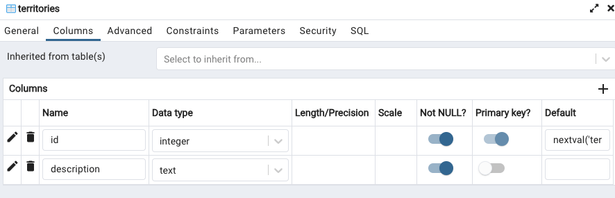 Let’s build the territories table. Looking at the ER diagram, we need a primary key id, and a description that is NOT NULL, but doesn’t need to be unique. Let’s build that: