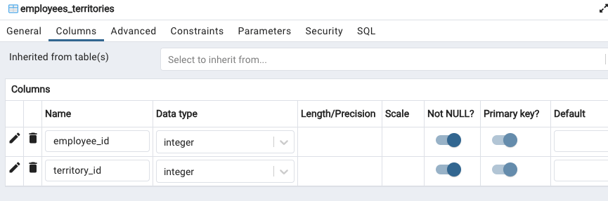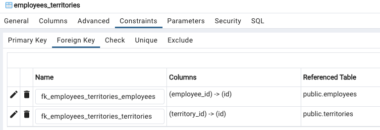 There’s a many-to-many relationship between employees and territorires, so let’s alter the employees_territories table: