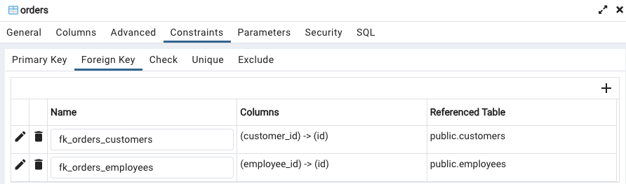 If we refresh, then look at properties of the orders table, and then go to the constraints tab > foreign key sub-tab, we will see the following: