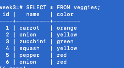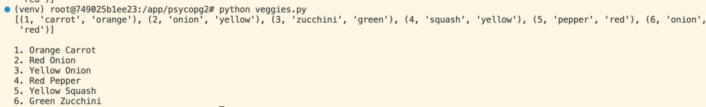 - inside veggies.py file, build out script to connect to PG DB and run RAW SQL queries: