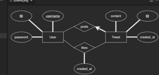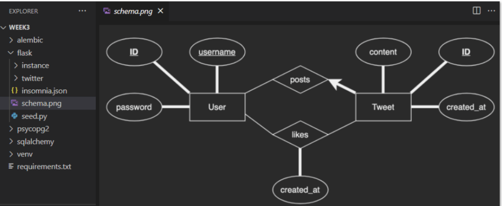 To build a twitter/X like application, like above, first need to build the DB tables for the above ER diagram, using Flask’s migration tool.