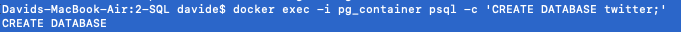 docker exec -i pg_container psql -c 'CREATE DATABASE twitter;'