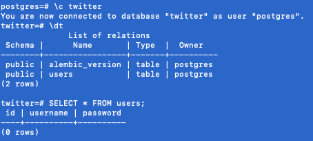flask db migrate // create migration file, stored under flask/twitter/migrations/versions folder