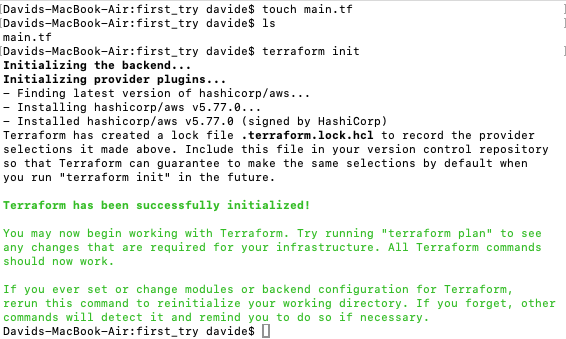 Then, in the folder I had crreated, I entered $ terraform init” and got this output: