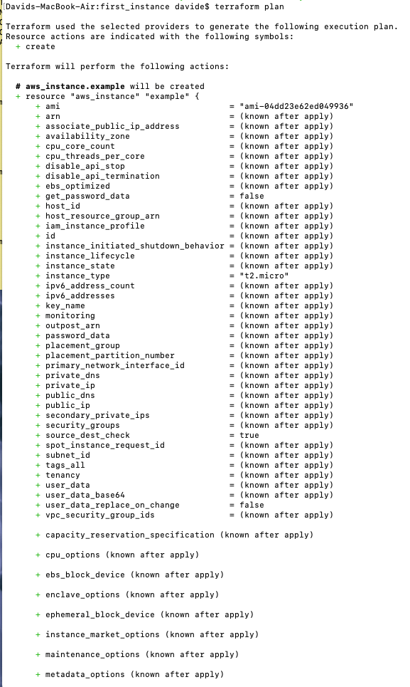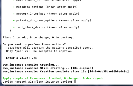 This shows you what Terraform will do, and the + signs indicate what will be added. Now, let’s actually apply these changes with $ terraform apply