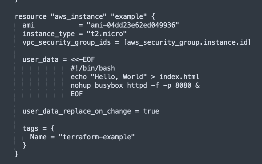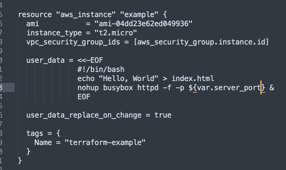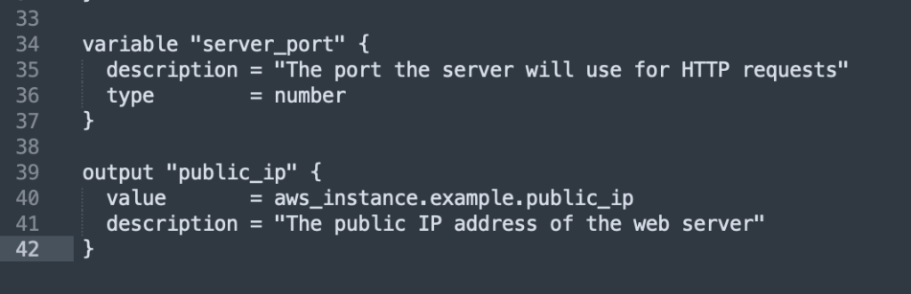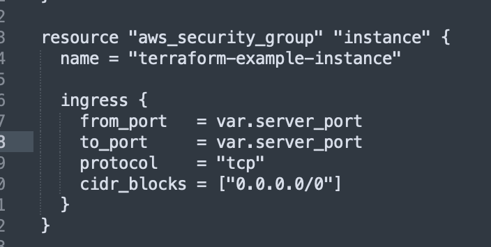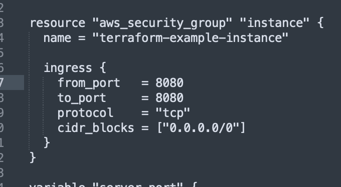 In my previous post around spinning up an EC2 instance using Terraform, I concluded my notes with how the main.tf (the main code for the project that created the EC2 instance) repeated the port 8080 in two different sections of the code: both in user_data and when creating a security group. It’s better to not Repeat Yourself (DRY), so that one only has to update one piece in the code if revisions are necessary. Terraform helps with that, by offering input variables. Here’s the general syntax: