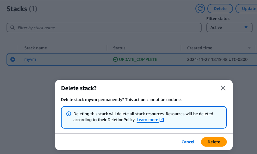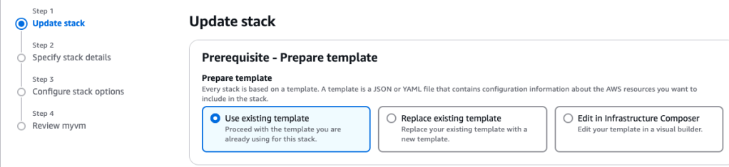 Right now, I have a t3.micro instance running – I’d like to modify it’s capacity. Back on the CF page, I select the stack and there is an ‘update’ option.