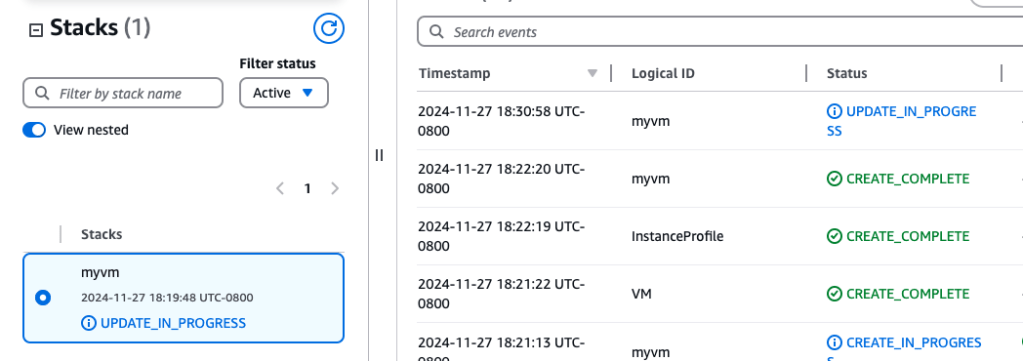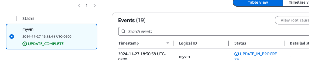 I didn’t make any other changes, just clicking through to the end like before – basically running through the initial steps of spinning up the CF template. And just like before, CF started working on the stack, displaying a UPDATE_IN_PROGRESS status message.