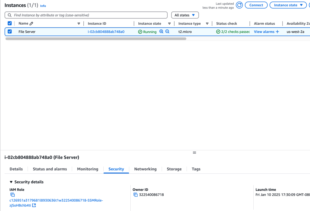 One EC2 instance has been instantiated, with an IAM role attached that gives permissions for (me) to connect to the instance outside of ssh – by using the AWS Systems Manager Session Manager.