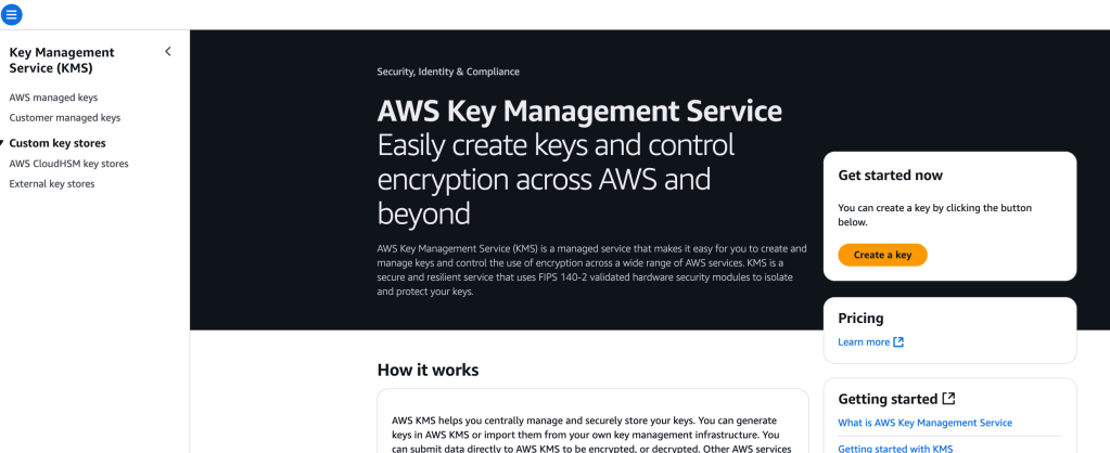 With the KMS service, I can get started right away with creating a key: