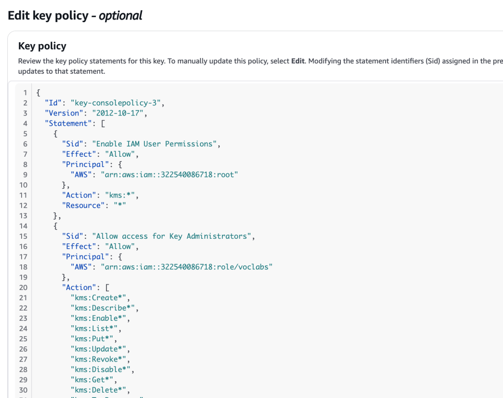 This completes the creation of a symmetric AWS KMS key, giving ownership of that key to thte IAM role that I indicated earlier.