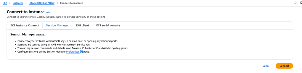 In order to use the newly-created KMS key, AWS credentials will need to be configured on the File Server EC2 instance. Let’s connect to the instance using Session Manager: