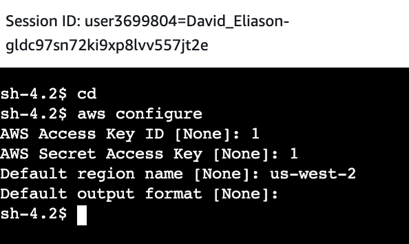 Prompts are given for configuring: AWS Access Key ID, AWS Secret Access Key, default region name, and default output format: