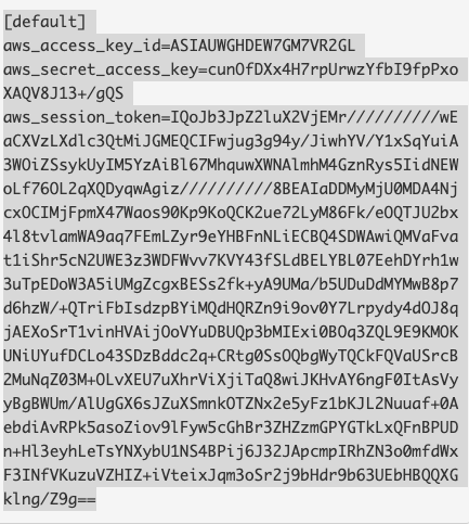 The values for aws_access_key_id, aws_secret_access_key, and aws_session_token are pasted into ~/.aws/credentials file