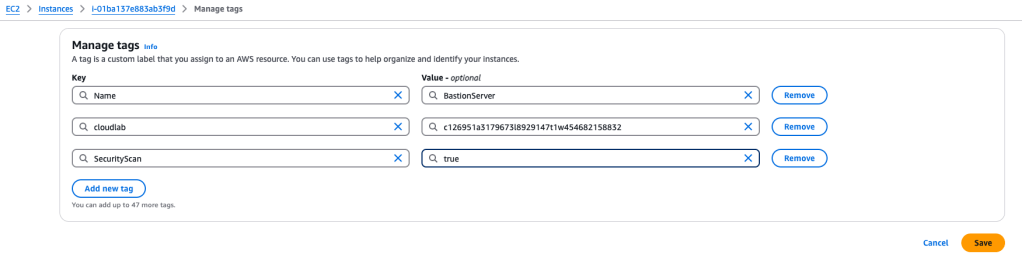 First I have to tag the EC2 instances I want to target, that will be the assessment target for Amazon Inspector Classic. I select my instance of interest, and create a name-value tag