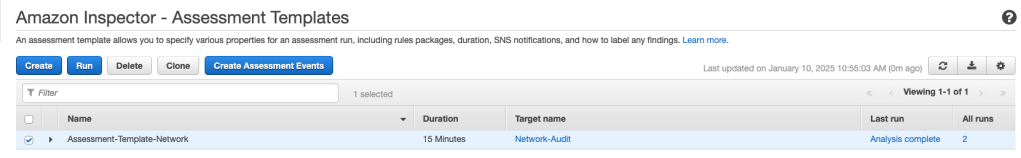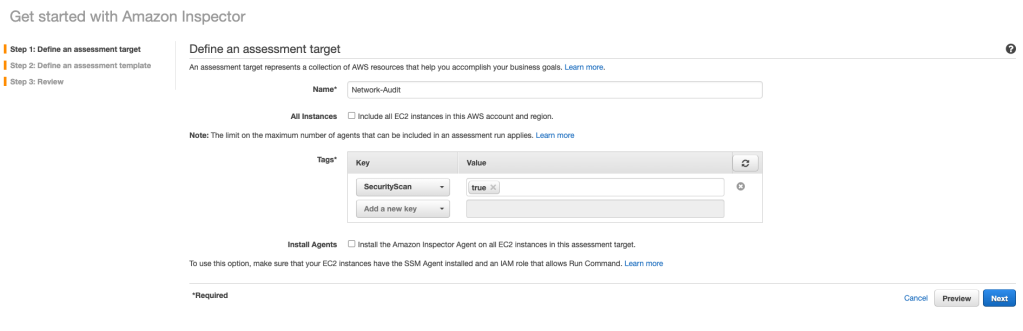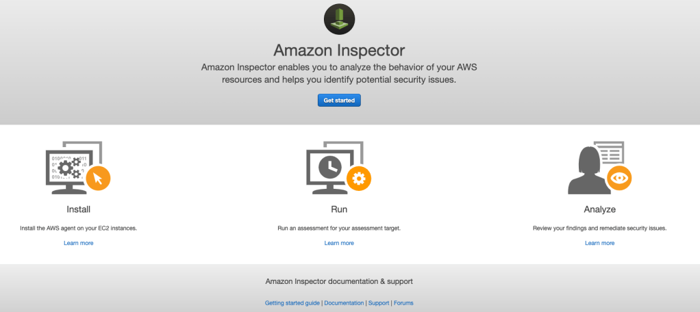 Next, I want to **configure** and run Amazon Inspector, using the network reachability rules package. Sometimes instance types won’t accept the installation of Inspector agents, so using this method bypasses that issue.