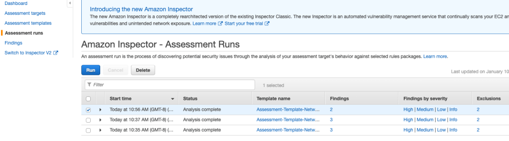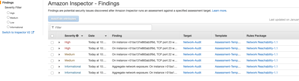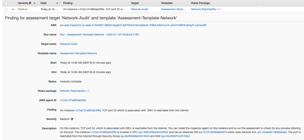 Now I get to analyze the Amazon Inspector findings! The findings that these rules generate show whether your ports are reachable from the internet through an internet gateway (IG) (including instances behind Application Load Balancers or Classic Load Balancers), a VPC peering connection, or a virtual private network (VPN) through a virtual gateway. These findings also highlight network configurations that allow for potentially malicious access, such as mismanaged security groups, ACLs, and internet gateways. Good stuff!