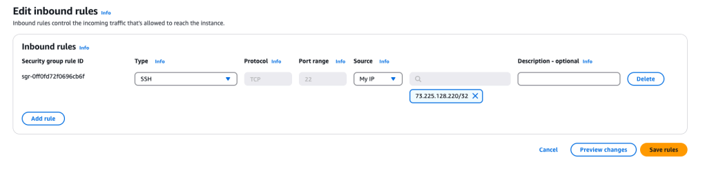A link to the security group in question is provided, so I click on that. Now I can edit the inbound rules by selecting the Inbound Rules tab, and editing the particular rule. I flat-out deleted the Telnet (port 23) rule, and edited the SSH rule so that instead of wide-open (“0.0.0.0/0”), I limited it so that only my IP address has access to port 22: