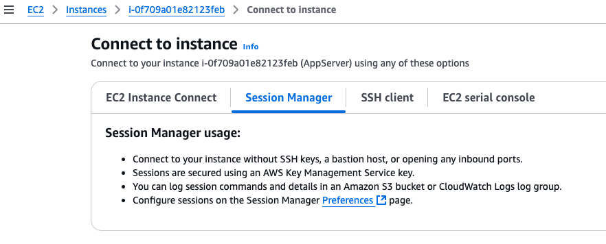 We will bypass the need for a bastion server by connecting to the app server directly using Session Manager: