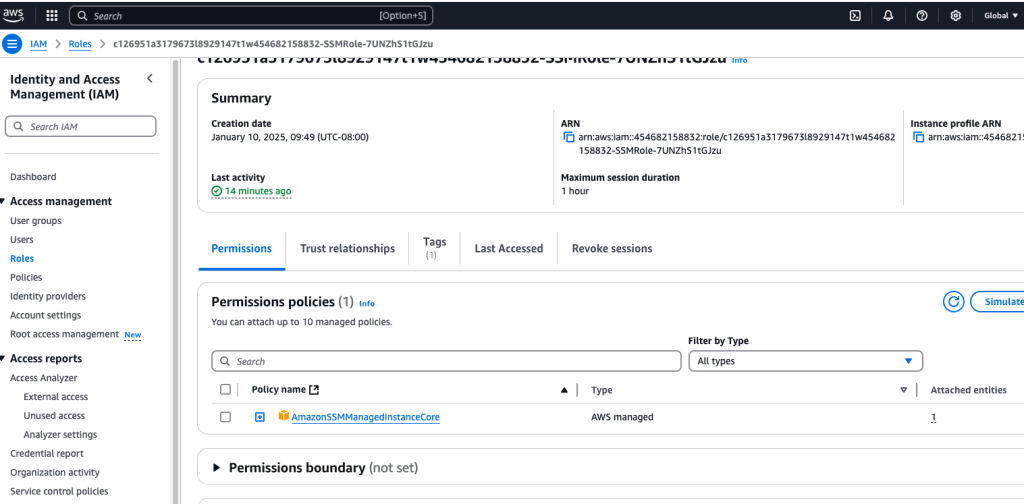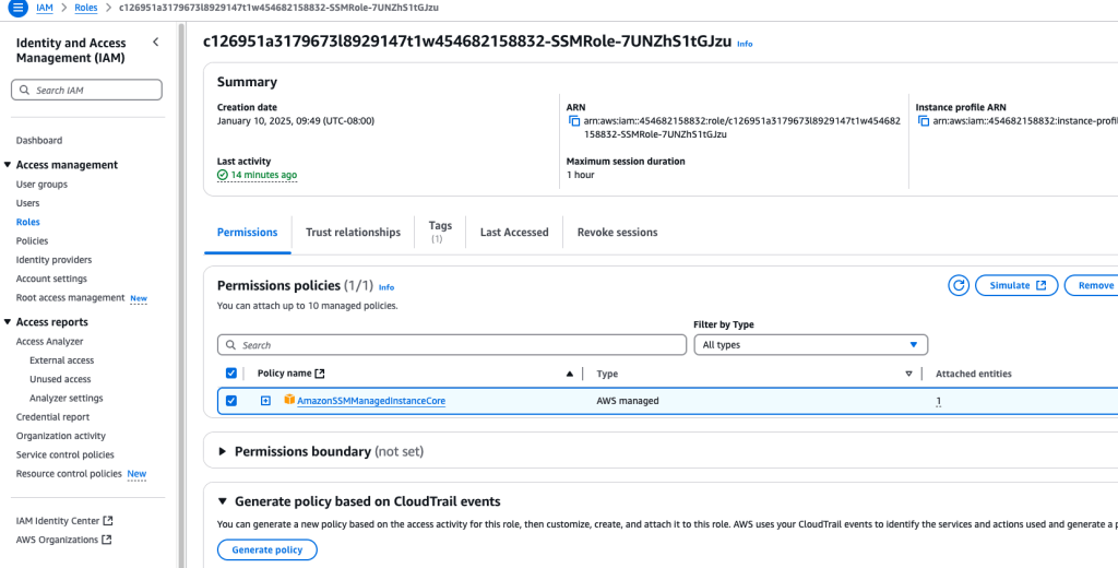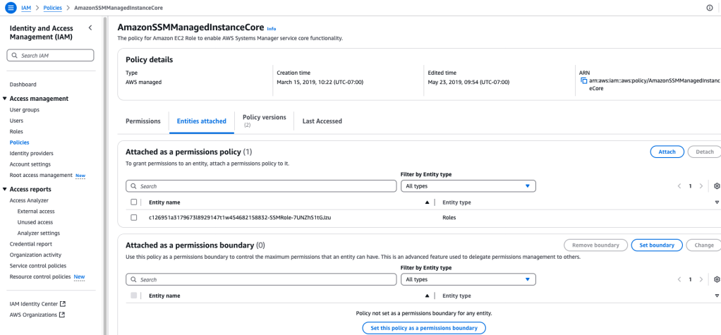 The app server allowed this Session Manager connection through creating and assigning an IAM role to that instance. In IAM services, we create a role that has the AmazonSSMManagedInstanceCore policy attached to it: