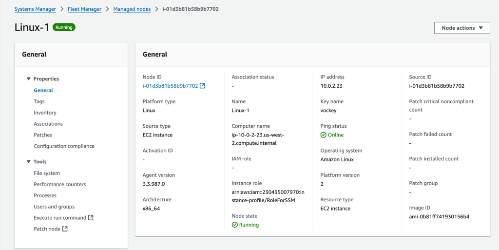 Select a node, Linux-1 here, choose Node Actions (drop-down menu) and choose Node Overview. Here you can view details about the specific instance, such as Platform type, Node type, OS name, and the IAM role that allows you to use Systems Manager to manage this instance.