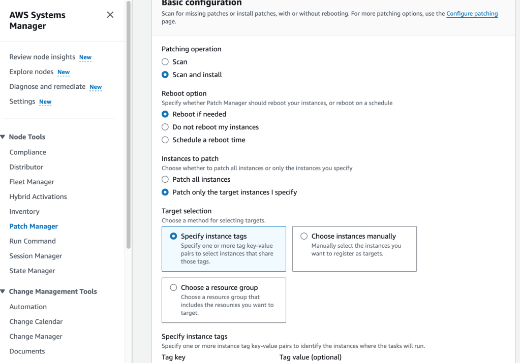 Back in Systems Manager > Patch Manager, I select ‘Patch Now’. I enter the same config values and steps as with the Linux instances, but this time, when specifying the key-value values for the Target Selection, I specify ‘WindowsProd’ instead.