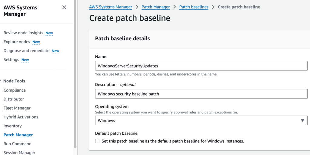 Now that the Linux instances have been patched, it’s time to turn the focus to the Windows instances! There are default patch baselines available for Windows instance, too, but I want to create a custom patch baseline.
