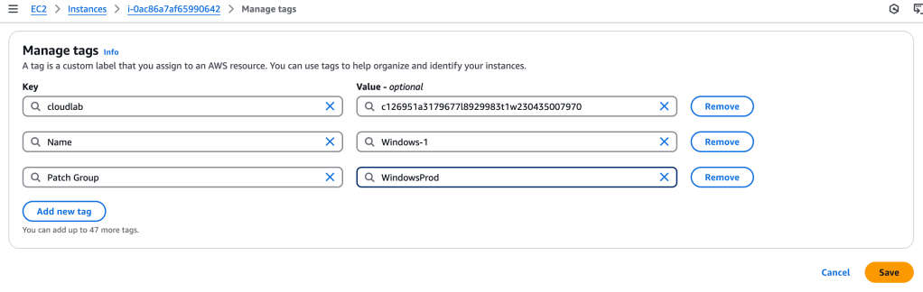 First, we need to tag the Windows instances. I add these key-value value tags to all three Windows instances.
