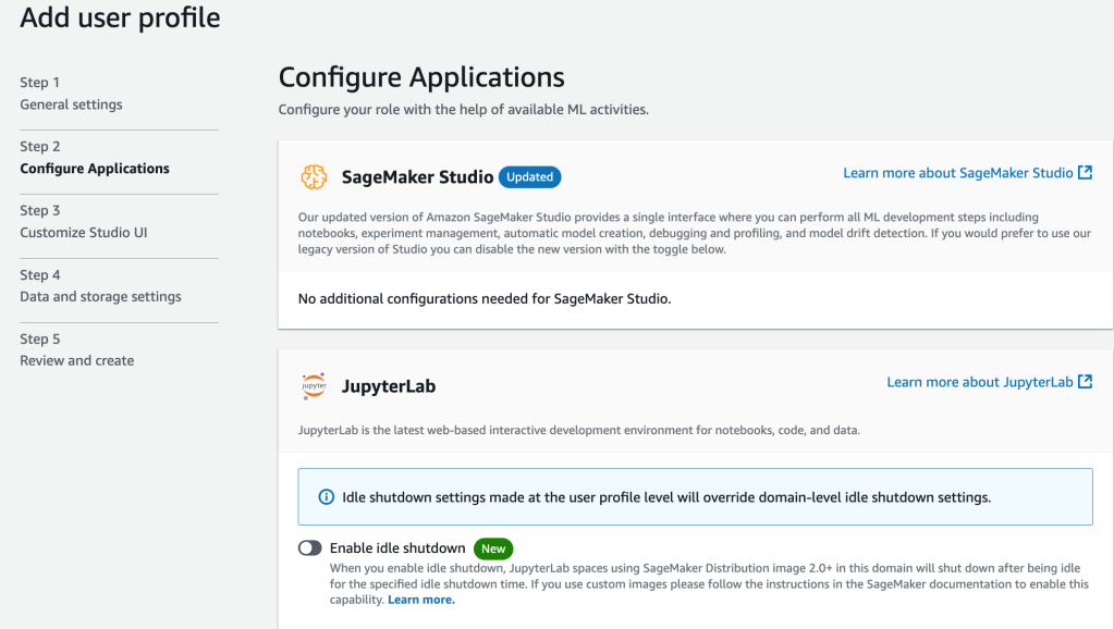 I create the User Profile: name, permissions, tags. Next is the option to configure applicaitons, like Studio or JupyterLab