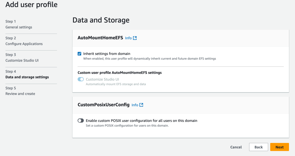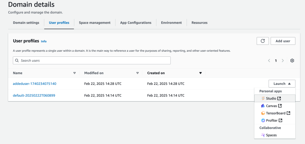 The setup takes a few minutes to provision. Once the domain is setup, there is a default user which has robust IAM permissions. I created a second user, who will be able to actually launch one of those aforementioned IDE/apps, like Studio; there will be lots of users, potentially, so you have to control permissions and access.