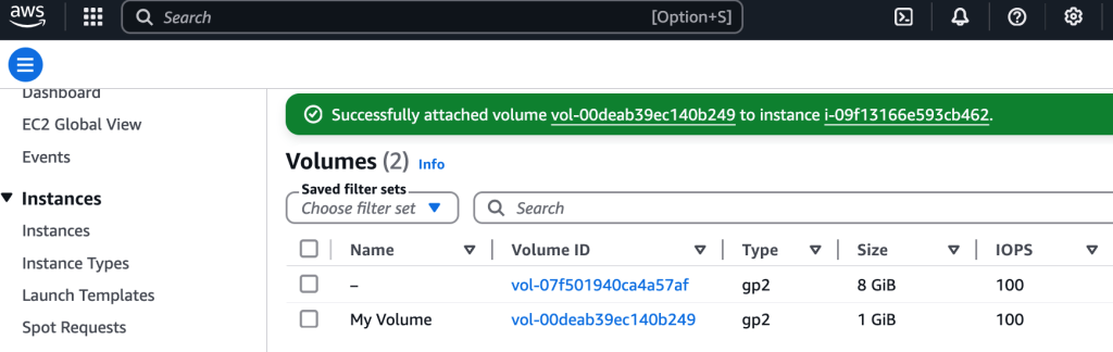 I have a t3.micro EC2 instance located in us-west-2a AZ. It has a public IPv4 and private IPv4 address. It has a 8GiB volume EBS attached as /dev/xvda, which is not encrypted, 100 IOPS as gp2 type. I want to create a new volume, so I select a really cheap instance: gp2 with 1 GiB and then attach it to the EC2 instance